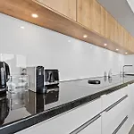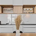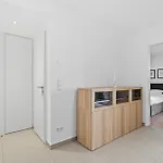 A kitchen features coffee and tea making equipment, along with a microwave, a refrigerator, and kitchenware for self-catering purposes. Al Gasperich bus stop is around a 5-minute drive from Modern 1-Br Apartment With Balcony In Cessange. Enjoy your stay at a sunny patio.